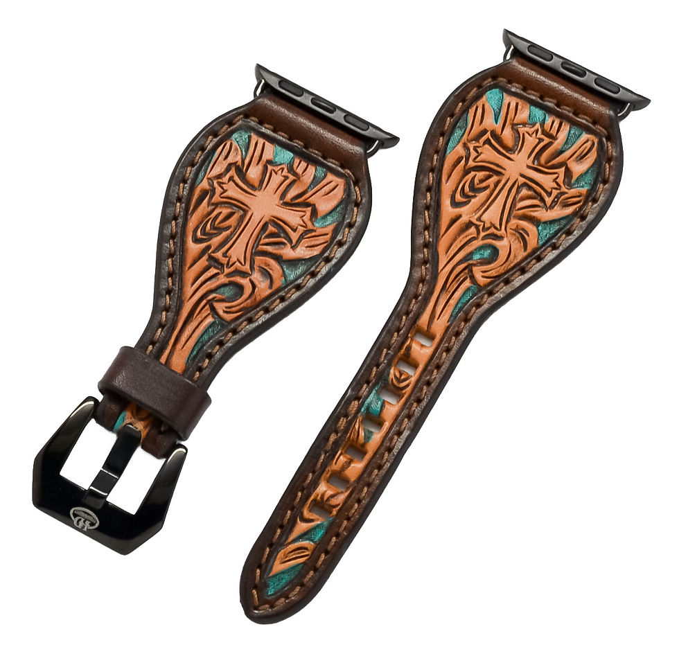 Leather Watch Band - Hand Carved Cross Design, Turquoise background
